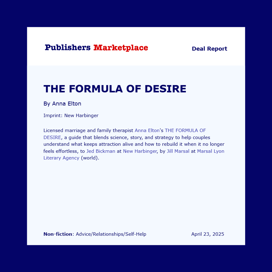 I’m thrilled to officially share that my new book, The Formula of Desire, has been acquired by New Harbinger Publications. Represented by Jill Marsal of Marsal Lyon Literary Agency, the book will be edited by Jed Bickman.